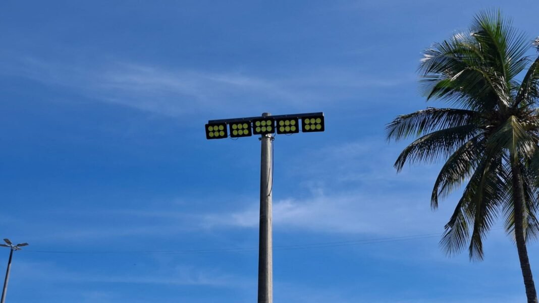 De acordo com a Secretaria, cada poste está recebendo cinco refletores de LED de 300W, totalizando 1.500W por ponto de iluminação. Esse conjunto substitui a tecnologia anterior, que já apresentava desgaste e consumia mais energia, ao mesmo tempo em que entregava uma iluminação menos eficiente.
